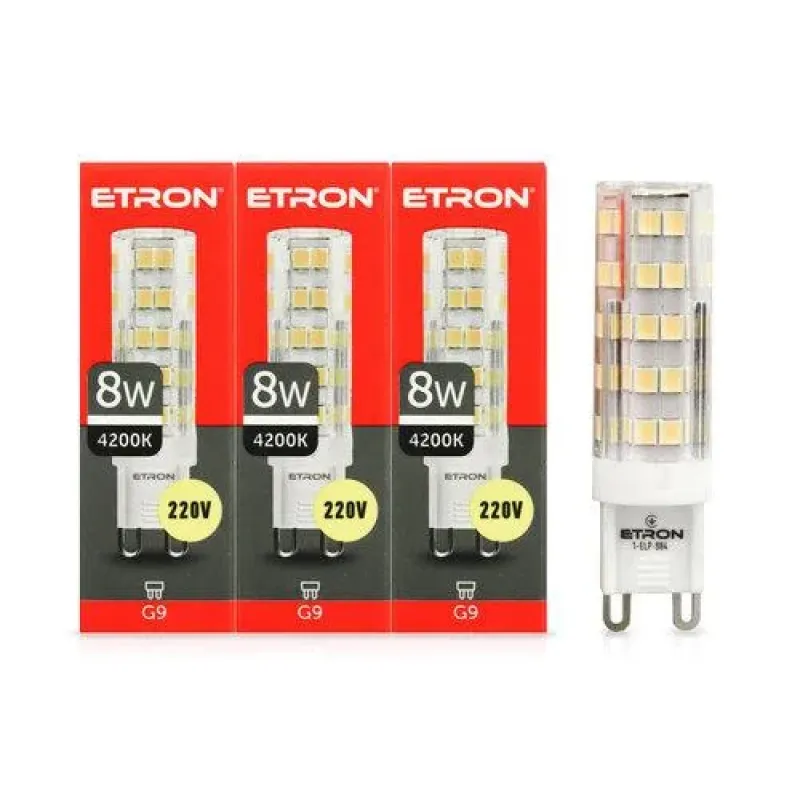 Комплект світлодіодних ламп ETRON G9 8Вт 4000K 220V (3 шт)ETRON 1-ELP-884 — це комплект компактних світлодіодних ламп із цоколем G9, призначених для точкових світильників, люстр, підвісів та декоративних освітлювальних рішень. Потужність 8 Вт забезпечує яскравість 660 лм.