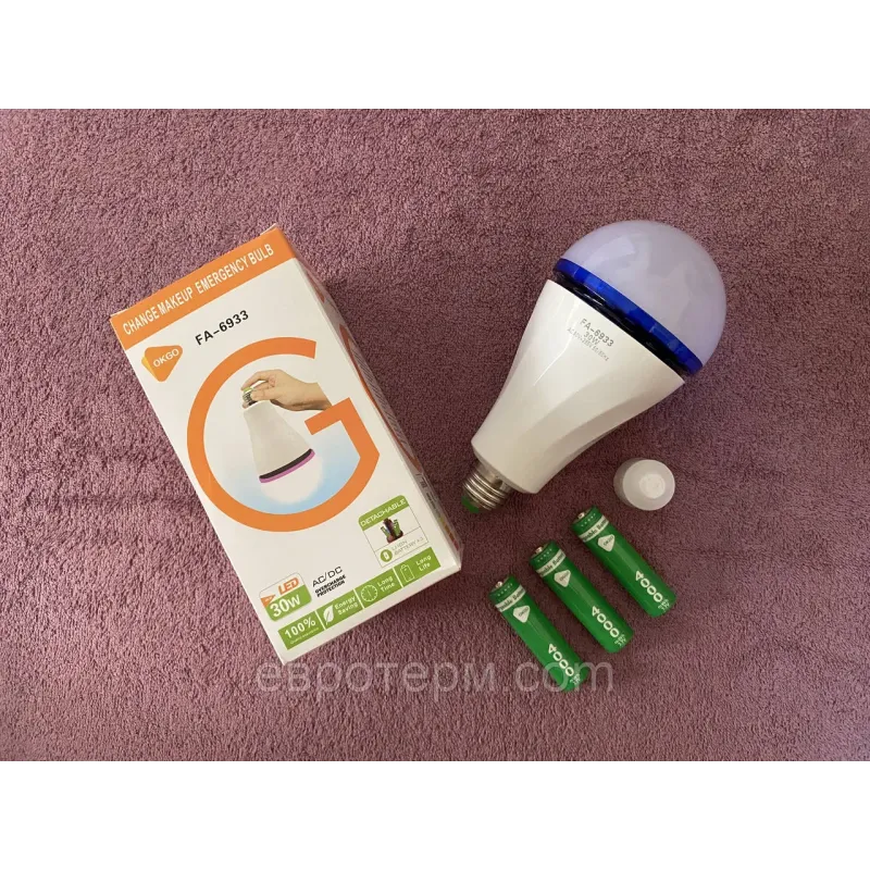 Ця лампочка — ідеальний варіант для дому, квартири та не тільки! Лампа акумуляторна OKGO FA-6933 світлодіодна E27 30W — це автономна аварійна лампа з трьома змінними акумуляторами 18650 у комплекті.