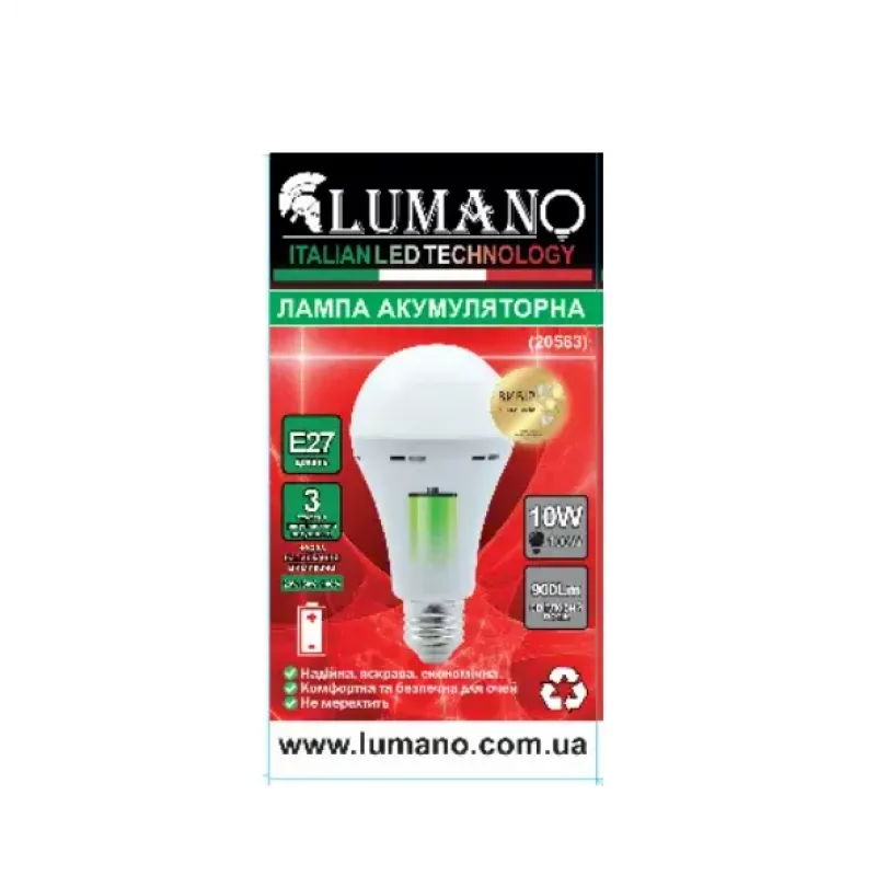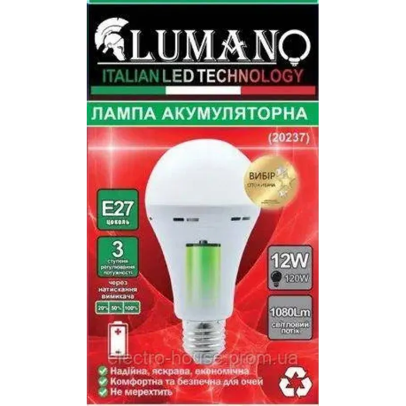 Лампа акумуляторна LED Emergency A70-12W 6000К Е27 (20237) гарантія 12міс TM LUMANOАкумулятор вбудований, не знімний, При повному навантаженні працює 4 години, при неповному 7-15