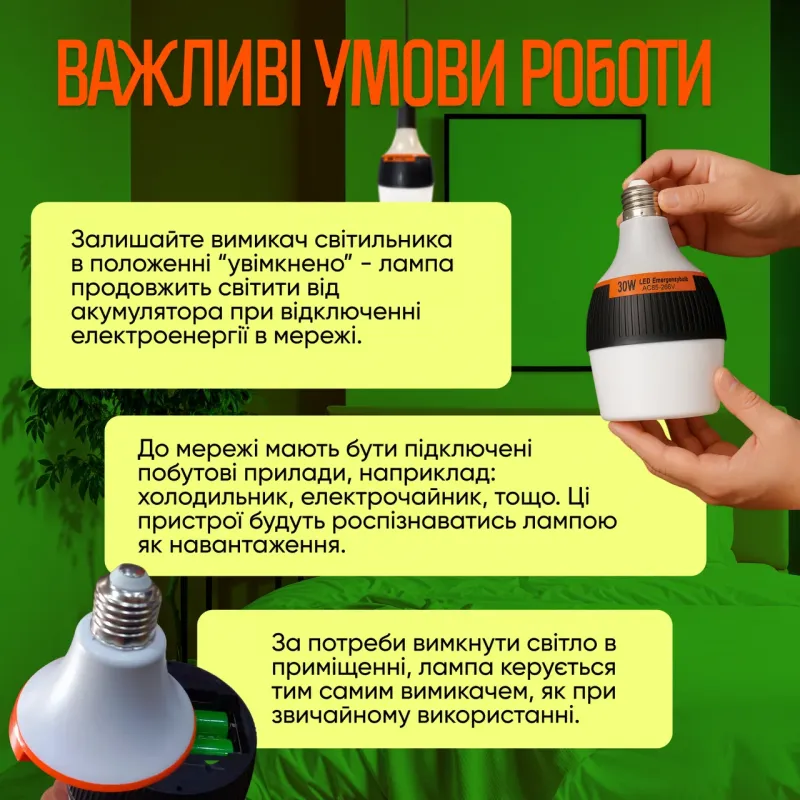 Заряджається Led лампа від мережі, коли вона увімкнена (світить). Працює як звичайна лампочка, коли є електрика. Під час вимкнення електроенергії лампа автоматично переходить на роботу від акумуляторів і знижену яскравість для економії заряду акб.