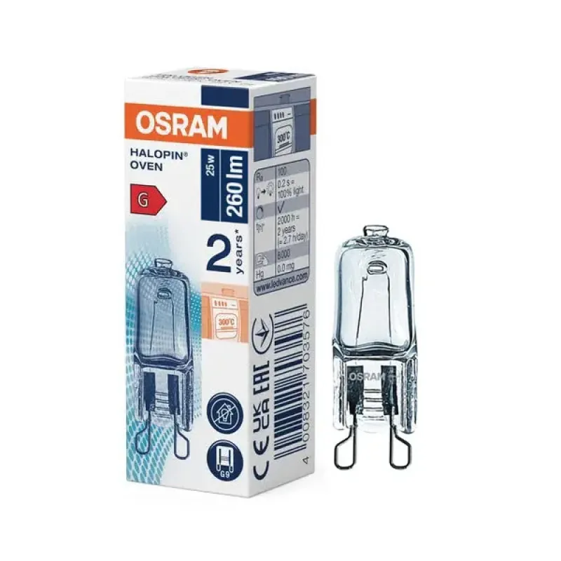 Для контролю процесу приготування їжі виробники обов'язково передбачають у духовках підсвічування, щоб уникнути необхідності зайвий раз відкривати її або діставати деко. Osram 66725 HALOPIN OVEN 25W G9 230V 300°C - розроблена спеціально для застосування в духовці і витримує температуру до 300 градусів за Цельсієм. Виконана у формі капсули з прозорим кольором колби і типом цоколя G9. Її енергоспоживання становить близько 25 Вт, при цьому яскравість світлового потоку досягає 260 Lm, що дозволить Вам спостерігати за тим, як готується Ваше блюдо в духовці і не упустити нічого важливого. Не менш важливим моментом є чималий ресурс служби для даного типу ламп до 2000 год.