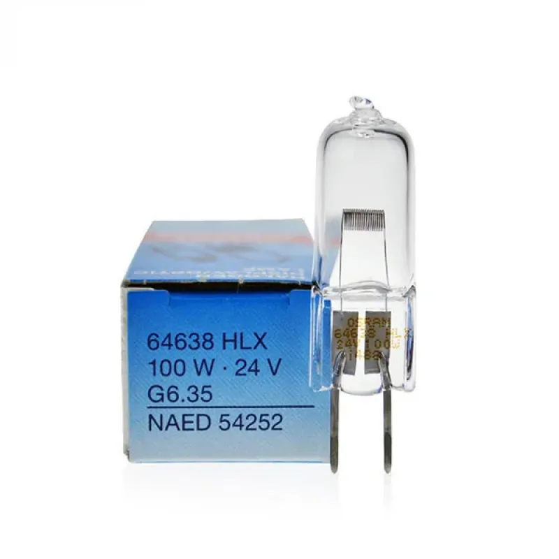 Osram 64638 HLX 100W 24V G6.35 - одноцокольна галогенна лампа потужністю 100 Вт без рефлектора. Тип цоколя - G6.35. Колірна температура - 3100 K. Термін служби - 300 годин.
