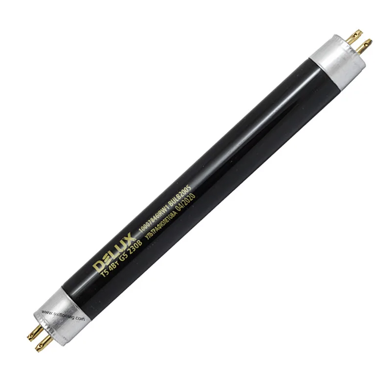 Лампа люмінесцентна ультрафіолетова T5 4w/08 BLB DELUX G5d 10007846Лампа люмінесцентна ультрафіолетова T5 4w/ 08 BLB DELUX G5d застосовується в детекторах валют Спектр-5М і аналогічних приладах для виявлення підробок сторінок паспортів або бланків зі спеціальним напиленням, розрахованих на використання люмінесцентних ультрафіолетових ламп з індексом кольоровості 08 і довжиною 150 мм. Лампа також може застосовуватися для виявлення тріщин в обшивках автомобілів або для візуальних ефектів, наприклад, на дискотеках, коли в ультрафіолетовому світлі світяться білі речі.