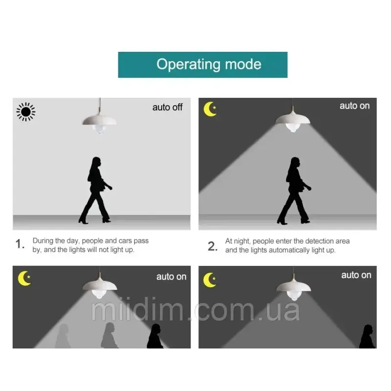 Лампа може не спрацьовувати, якщо на неї попадає інше світло. Лампа світить тільки в сутінках та темряві.