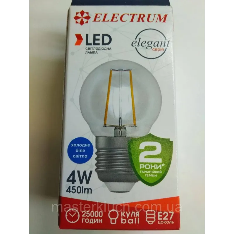 Лампа світлодіодна куля 4Вт E27 ElectrumСвітлодіодна лампа зі скляною колбою сферичної форми має світловіддачею понад 110 лм/Вт. В електромережу з напругою 220 В підключаються без додаткових пристроїв. Призначена для використання в світильниках загального освітлення, люстри і для декоративного підсвічування.