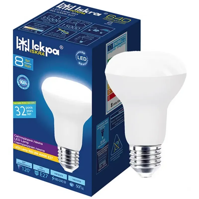 Світлодіодна рефлекторна лампа ISKRA R63 8W 4000K E27 призначений для використання в "точкових" світильниках. Також застосовуються для загального та місцевого освітлення в адміністративно-общественных та побутових приміщеннях. У конструкції використовуються світлодіоди останнього покоління з підвищеною світловіддачею та якісні електронні комплектуючі, що забезпечують надійність та довговічність ламп.