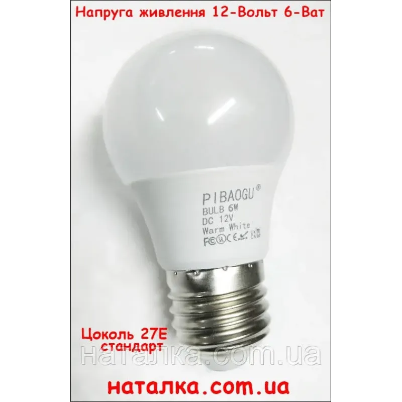 Лампочка 12 Вольт 6 ватів із цоколем Е27(стандарт). Лампочка працює від будь-якого джерела постійного струму +12 Вольт (будь-який 12 Вольтовий акумулятор). Споживання струму 1-ї лампочки від акумулятора в межах до 0,45 А/г. Колір світла, що випромінюється Теплий з відтінком жовтого.