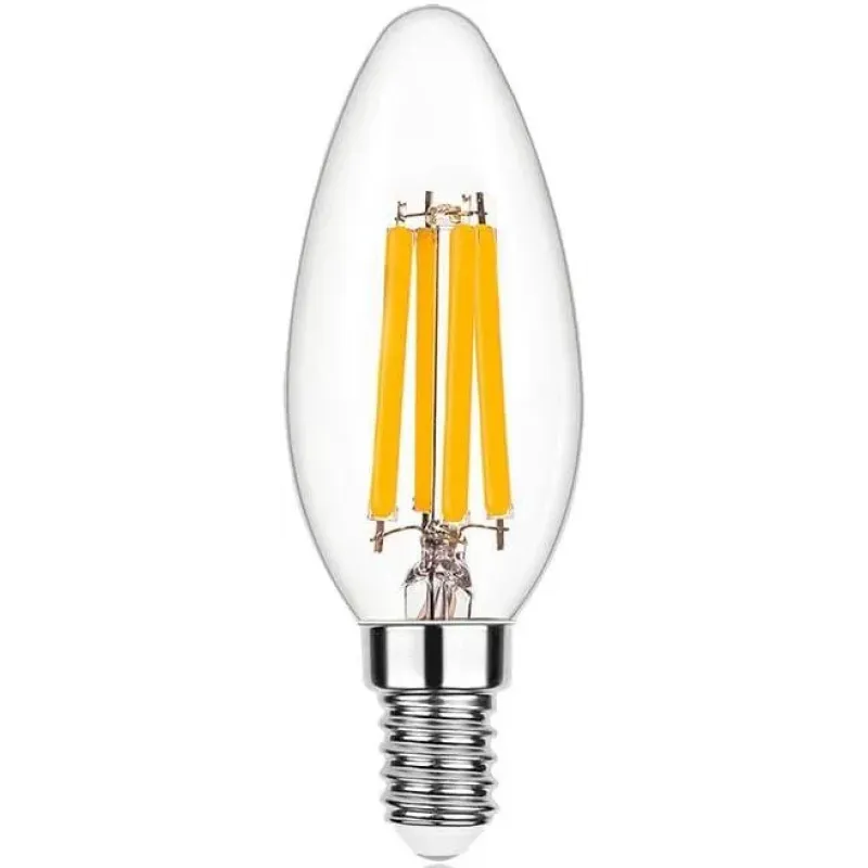 Світлодіодна філаментна LED-лампа — це сучасний вигляд лампи, яка зовні імітує лампу розжарювання. У ній замість традиційної вольфрамової нитки використовуються прозорі скляні нитки (філаменти), на яких розташовані світлодіоди. Філаменти розташовані по всьому об'єму колби, що забезпечує рівномірне світіння на всі боки, на відміну від спрямованого світла звичайних LED-ламп. Скляний абажур із високою якістю і високою світлопроникністю. Ця лампа не тільки знизить Ваші витрати на електроенергію, але й створить затишну атмосферу з природним світлом. Цоколь: Е14. Колірна температура: 2200K. Світловий потік: 400 люменів.