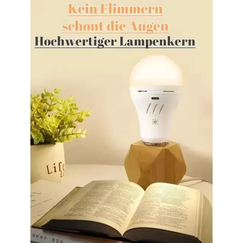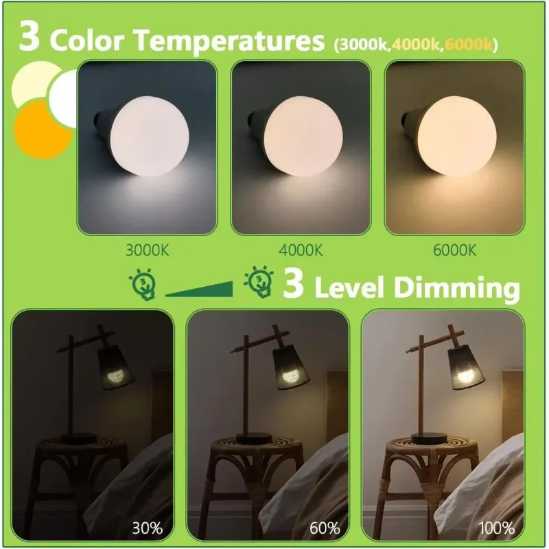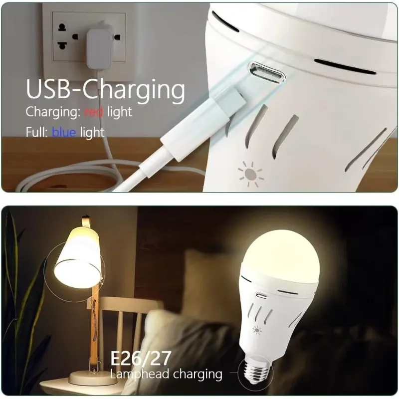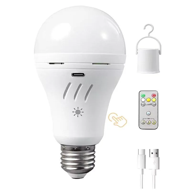Лампочка з вбудованим акумулятором 2600 мАч і пультом, цоколь Е27. Заряджається як при роботі через цоколь, так і через USB Type-C шнур. Можна регулювати колірну температуру і потужність як вручну, так і з пульта.