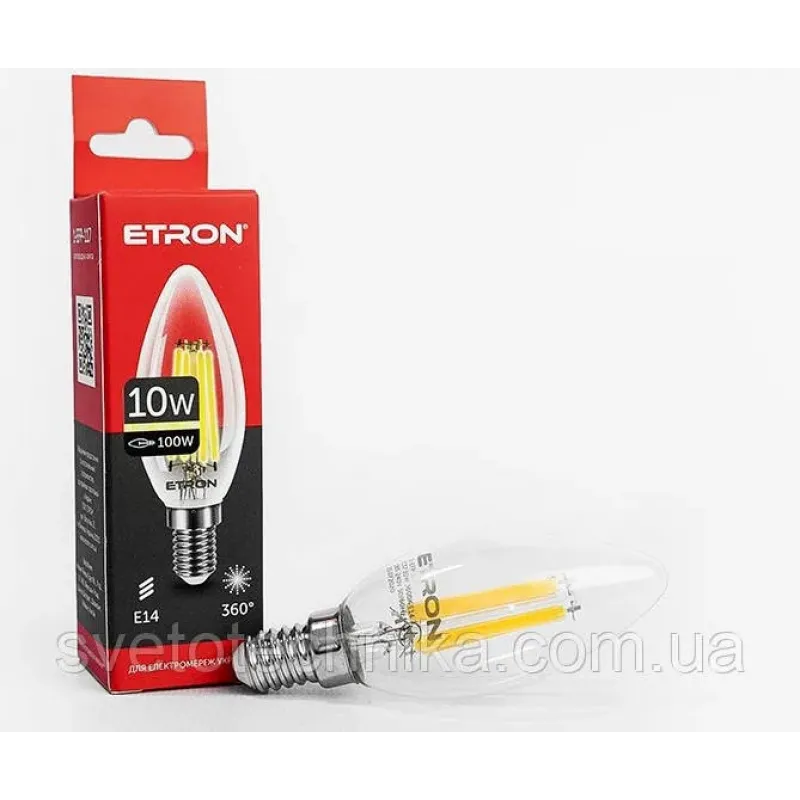 Цоколь E14 Особливості філаментная Кут 360 ° Еквівалент потужності лампи розжарювання 60 Вт Колір світіння Холодний Форма колби Свічка Тип Світлодіодні лампи Кількість ламп в упаковці, шт 1 Світловий потік 600 Лм Напруга живлення 185-240 В Електрична потужність 6 Вт Висота 98 мм Термін служби лампи 30000 ч Тип лампи C37 Температура світіння 4200 К Діаметр 35 мм Індекс передачі кольору, Ra> 90 Колір колби Прозорий Країна-виробник товару Китай Країна реєстрації бренду Україна Бренд ETRON Гарантія 24 місяці