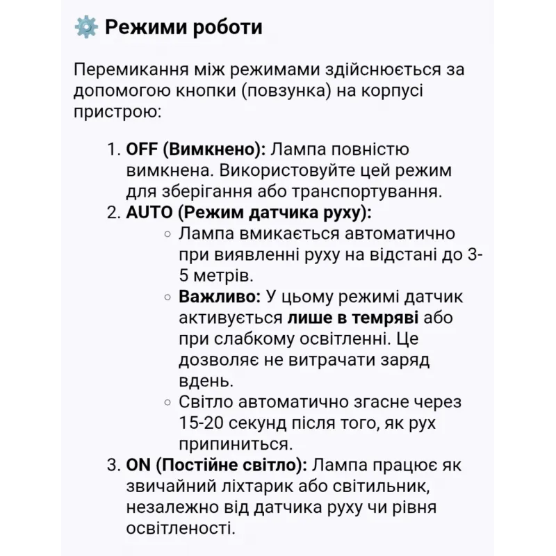 Однією з особливостей цього пристрою є можливість вибору між режимом постійного освітлення та автоматичним включенням при виявленні руху, що робить його ідеальним рішенням для освітлення коридорів, спалень або будь-яких інших приміщень, де потрібне додаткове світло.