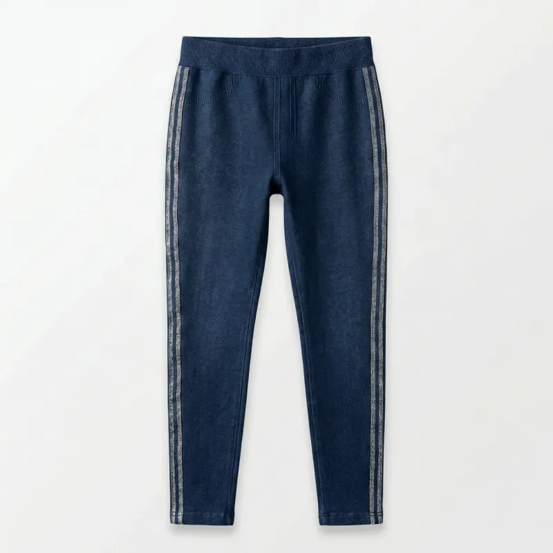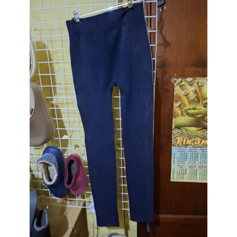 Стильні та неймовірно зручні жіночі лосини (джеггінси), які поєднують у собі комфорт трикотажних легінсів та зовнішній вигляд джинсів. Ця модель виготовлена з еластичного стрейчевого матеріалу, який ідеально сідає по фігурі, підкреслюючи силует, але не сковує рухів. Головна "родзинка" моделі — блискучі лампаси (смужки) з боків, які візуально видовжують ноги та додають образу спортивного шику. Тканина має фактуру, що імітує джинс (у синьому кольорі) або класичний меланж (у сірому), при цьому вона м'яка і приємна до тіла. Широкий еластичний пояс забезпечує комфортну посадку на талії та легкий стягуючий ефект. Це ідеальний вибір для повсякденного носіння, прогулянок або відпочинку вдома. Характеристики: Тип: Лосини-джеггінси / Легінси Матеріал: Стрейч (поліамід/бавовна/еластан) — добре тягнеться Декор: Лампаси (срібляста смужка збоку) Кольори: Синій (під джинс), Сірий Розміри в наявності: 46, 48 (універсальний M-L) Сезон: Весна / Осінь