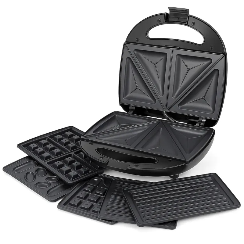 Универсальный прибор с четырьмя сменными насадками с антипригарным керамическим покрытием, сэкономит место на Вашей кухне и сделает приготовление всевозможных блюд быстрым и простым. Выпечка происходит быстро, т.к. 1000Вт вполне достаточно для домашнего приготовления. Для каждого блюда отдельные съемные формы, что удобно при чистке вафельницы имеет световую индикацию работы, означающие готовности к выпеканию или поджариванию. С каждой стороны прибора размещены нагревательные элементы в виде пластин, которые соприкасаются с приготовляемыми продуктами сверху и снизу – это обеспечивает быструю и равномерную готовку в бутерброднице. Нет необходимости переворачивать продукты как в сковороде