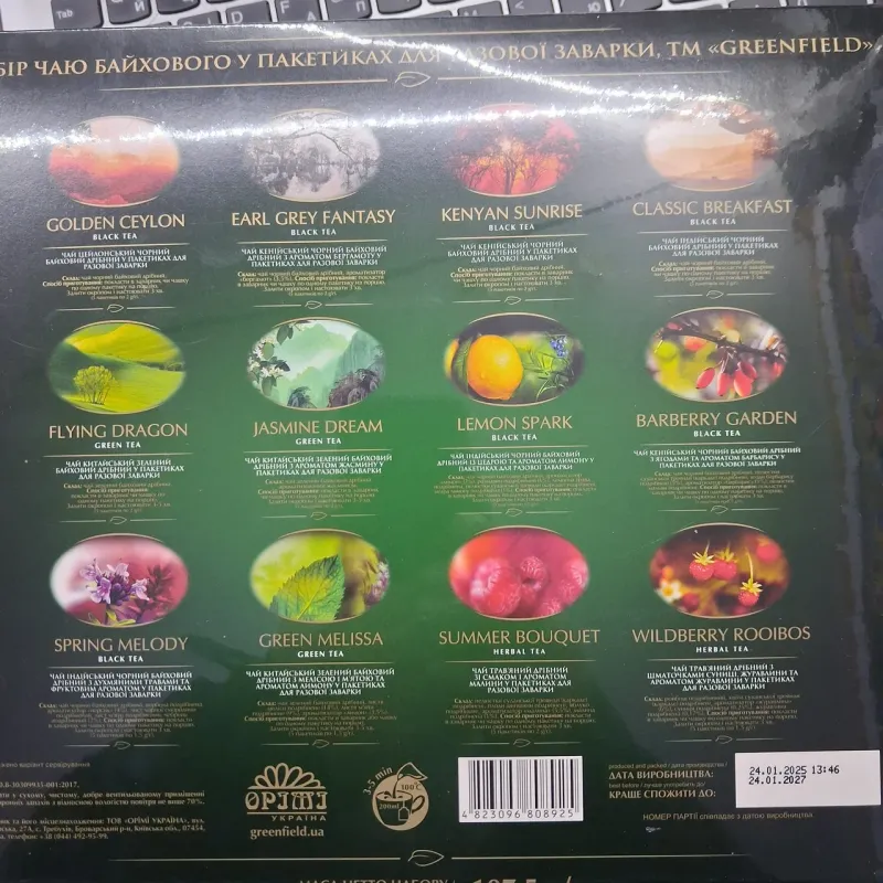 Ідеальний подарунок для поціновувачів чаю — колекція найкращих смаків Greenfield. Цей набір — справжня подорож у світ чаю. У великій красивій коробці зібрано 12 найпопулярніших сортів: від насиченого чорного та ніжного зеленого до екзотичних фруктових та трав'яних композицій. Це чудовий варіант для офісу, для дому (щоб кожен член сім'ї знайшов свій улюблений смак) або як презент колезі, вчителю чи близькій людині. Переваги набору: Різноманітність: 12 різних смаків в одній коробці. Свіжість: Кожен пакетик упакований в індивідуальне саше з фольги, що зберігає аромат роками. Зручність: Не треба купувати 12 великих пачок, щоб спробувати все. Презентабельність: Виглядає дорого та святково. Які смаки всередині (всього 60 пакетиків): Golden Ceylon: Класичний цейлонський чорний чай. Classic Breakfast: Міцний ранковий чай. Kenyan Sunrise: Насичений кенійський чай. Earl Grey Fantasy: Чорний чай з бергамотом. Flying Dragon: Традиційний китайський зелений чай. Jasmine Dream: Зелений чай із жасмином. Lemon Spark: Чорний чай з лимоном. Barberry Garden: Чорний чай з ароматом барбарису. Spring Melody: Чорний чай з чебрецем та м'ятою. Green Melissa: Зелений чай з мелісою. Summer Bouquet: Трав'яний чай зі смаком малини (без кофеїну). Wildberry Rooibos: Етнічний напій ройбуш із суницею.