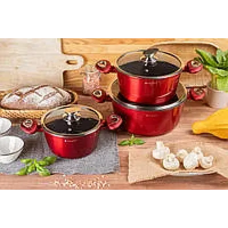 Набір посуду з нової преміум лінії відомого бренду Edenberg, який заслужив на довіру десятків тисяч домогосподарок Європи та України. Посуд виготовлений з литого алюмінію, що є досить міцним та міцним матеріалом. Плюс такий посуд стійкий до деформацій, має більш товсті стінки і дно, які рівномірно нагріваються і також рівномірно розподіляють тепло, що позитивно впливає на якість їжі, що готується, і її смакові властивості. Даний набір посуду внутрішньо покритий 3-х шаровим мармуровим покриттям. Посуд з мармуровим покриттям рівномірно та дуже швидко прогрівається. Крім того, мармурове покриття менше боїться гострих предметів, випадкових падінь, перепадів температур, а тому має довгий термін служби. Можна використовувати мінімум олії, що дозволить дотримуватися здорового харчування. А ще такий посуд незвичайно та добротно виглядає, особливий шарм колекції надає кольору зовнішнього металевого покриття. Покриття виготовлене на водній основі, що полегшує догляд та дозволяє надовго зберегти чудовий зовнішній вигляд. Каструля з кришкою 2.6 л, діаметр 20 см, Каструля з кришкою 4.4 л, діаметр 24 см, Каструля з кришкою 6.3 л, діаметр 28 см, 2шт підставки під гаряче
