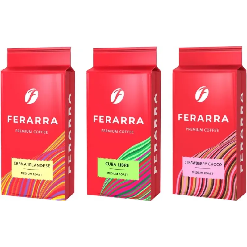 • **Ferarra Crema Irlandese (250 г):** Кава з ніжним ароматом ірландського крему, що додає напою вишуканості та м'якості.