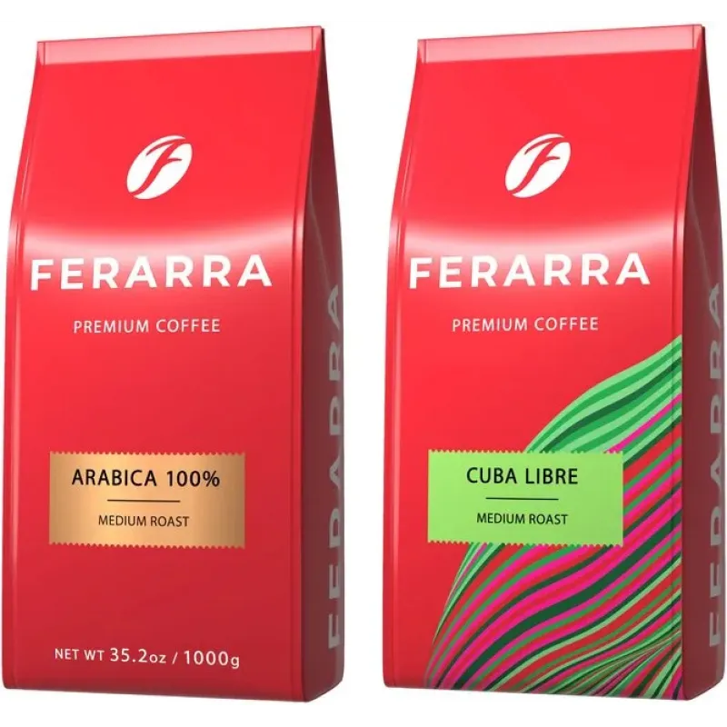 Набір включає дві пачки по 1 кг: Ferarra Arabica 100% (чиста арабіка) та Ferarra Cuba Libre (бленд арабіки/робусти з ароматом кубинського рому).