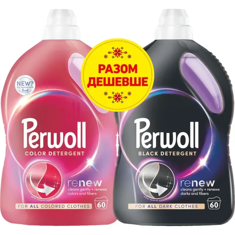 • **Включає:** Гель Perwoll Color Renew для всіх кольорових речей та Гель Perwoll Black Renew для всіх темних речей.