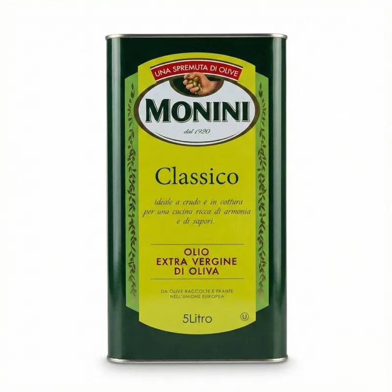 Представляємо **Оливкову олію Monini Classico Olio Extra Vergine di Oliva** об'ємом 5 літрів у традиційній зеленій металевій банці. Бренд Monini, заснований у 1920 році ("dal 1920"), є синонімом італійської якості та традицій у виробництві оливкової олії. Назва "Classico" (Класичний) підкреслює її універсальність та збалансований смак, що робить її ідеальною для повсякденного використання.