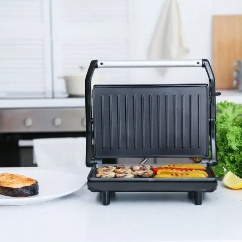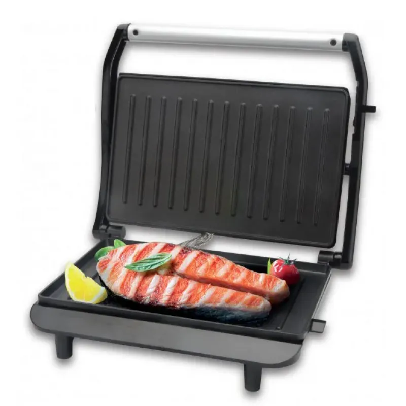 Корпус изготовлен из высококлассного термостойкого пластика черного цвета. Нагревательный элемент мощностью в 900 Вт обеспечит быстрое и равномерное нагревание одной рабочей поверхности с антипригарным покрытием.
