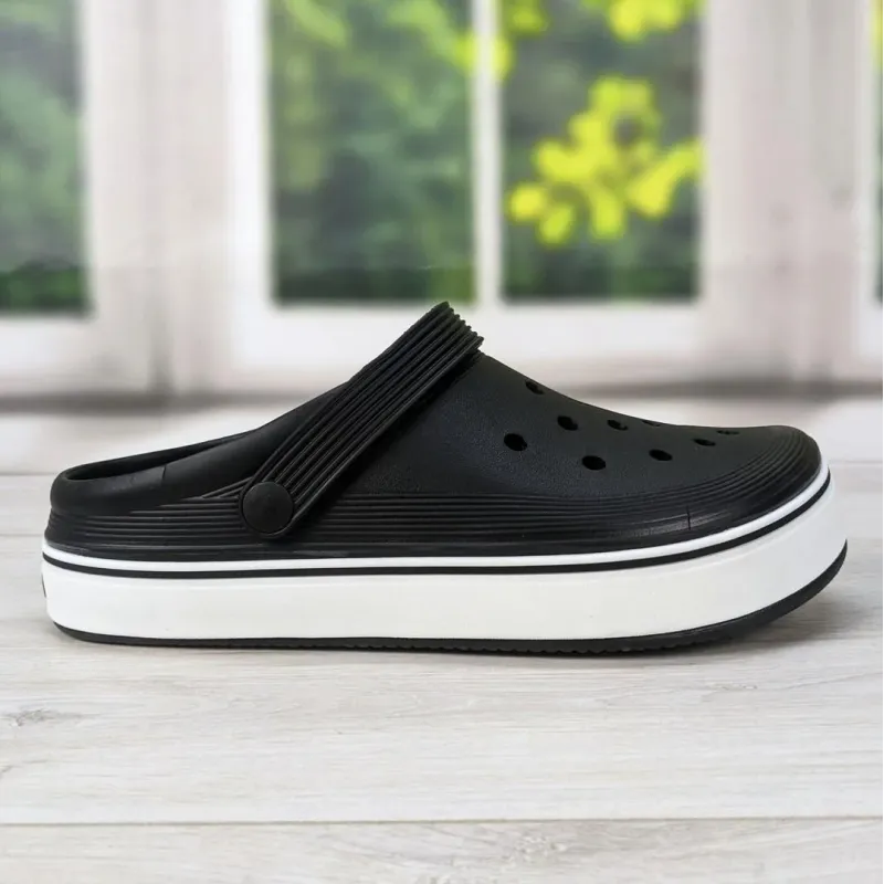 Класичні чоловічі сабо (крокси) від українського виробника Dago Style у універсальному чорному кольорі. Ця модель вирізняється стильною потовщеною підошвою білого кольору, що надає взуттю сучасного спортивного вигляду. Вони стануть чудовим вибором для тих, хто шукає практичне взуття на кожен день: для дому, прогулянок, пляжу, роботи в саду або професійного використання (для медиків, працівників кухні тощо). Взуття виготовлене з гіпоалергенного матеріалу ЕВА (піна). Воно неймовірно легке, еластичне та м'яке. Висока підошва забезпечує відмінну амортизацію при ходьбі, зменшуючи втому ніг. Поворотний п'ятковий ремінець дозволяє фіксувати стопу для більш активного руху або носити сабо як звичайні шльопанці. Матеріал ЕВА стійкий до вологи, не вбирає запахи та дуже легко миється. Перфорація у верхній частині забезпечує вільну циркуляцію повітря, тому ногам буде комфортно навіть у спекотну погоду. Чорний колір робить модель максимально практичною та невибагливою у догляді. Характеристики: Матеріал: Піна ЕВА (EVA) Колір: Чорний з білою підошвою Виробник: Dago Style Сезон: Літо / Цілорічно (у приміщенні) Стать: Чоловічі Розміри в наявності: 41, 42, 43, 44, 45 Країна виробник: Україна
