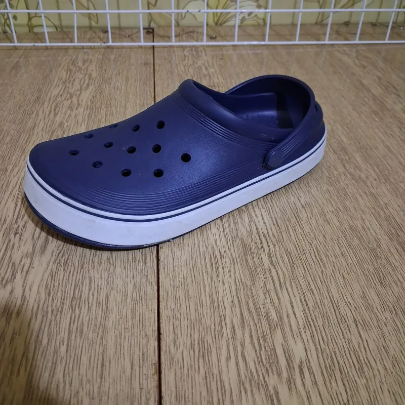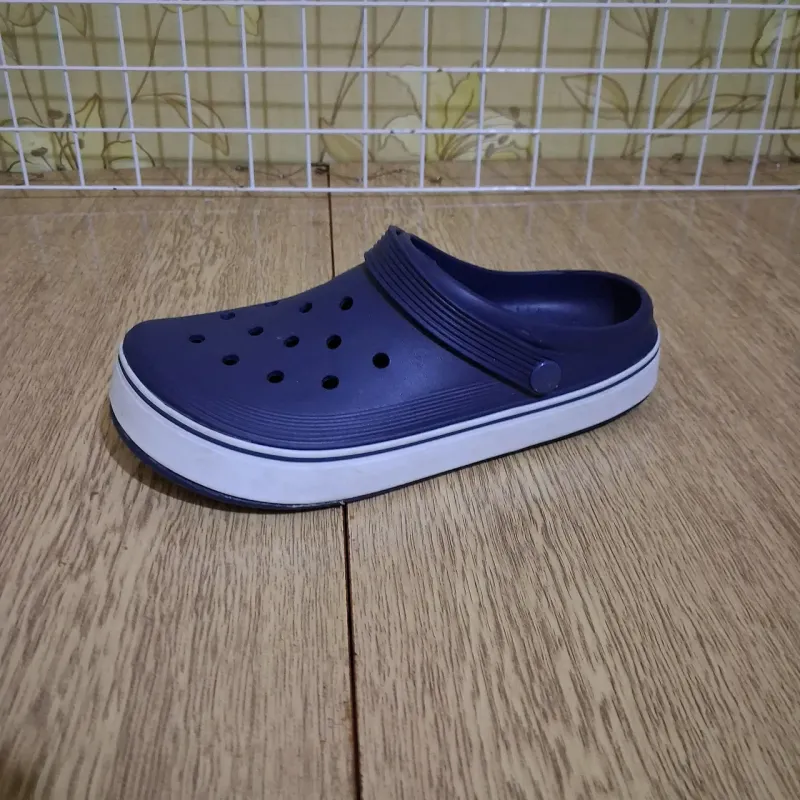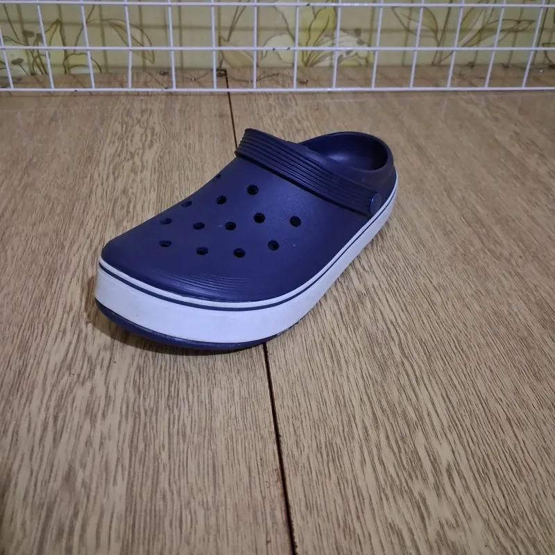 Універсальні та стильні чоловічі сабо (крокси) у темно-синьому кольорі. Ця модель виділяється ефектною білою підошвою, що надає взуттю сучасного спортивного вигляду. Ідеальний вибір для щоденного використання влітку, відпочинку на пляжі, роботи на дачі або для професійного використання (наприклад, медиками чи кухарями). Взуття виготовлене з високоякісної піни ЕВА (EVA), завдяки чому воно неймовірно легке та м'яке. Матеріал не вбирає вологу, легко миється та швидко сохне. Перфорація у верхній частині забезпечує відмінну вентиляцію, дозволяючи ногам "дихати" навіть у найспекотніші дні. П'ятковий ремінець надійно фіксує ногу, перетворюючи шльопанці на зручні сандалі для активної ходьби. Переваги моделі: Комфорт: Анатомічна форма та амортизуюча підошва знижують навантаження на стопи. Практичність: Стійкі до зносу, не бояться води та бруду. Дизайн: Класичний синій колір у поєднанні з контрастною білою платформою пасує до будь-якого літнього одягу. Характеристики: Матеріал: Піна ЕВА (EVA) Колір: Темно-синій з білою підошвою Сезон: Літо / Демісезон (для приміщень) Стать: Чоловічі Розміри в наявності: 41-45 Країна виробник: Україна