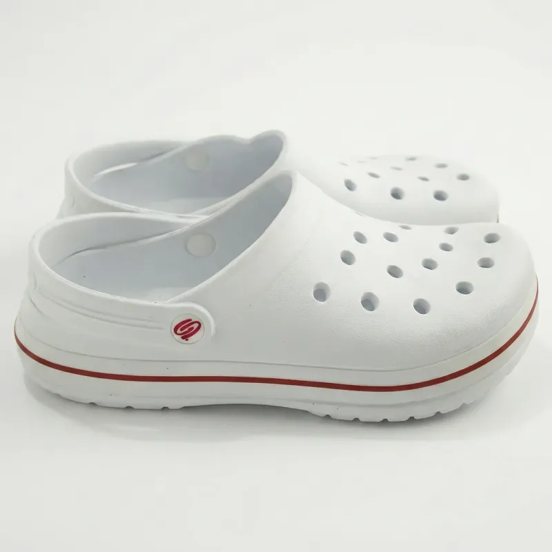 Ці білі чоловічі сабо з червоною окантовкою — ідеальний вибір для тих, хто шукає комфортне професійне або літнє взуття. Білий колір традиційно обирають медичні працівники, фармацевти, кухарі та працівники лабораторій, адже він асоціюється з чистотою. Модель виготовлена з гіпоалергенного матеріалу EVA (пінка), який легко миється, піддається дезінфекції та не вбирає запахи. Тонка червона смужка вздовж підошви та червоний логотип на кнопці додають моделі стильного акценту, розбавляючи стерильний білий колір. Завдяки перфорації зверху, ноги вільно дихають протягом усього дня. Поворотний ремінець дозволяє надійно зафіксувати сабо на п'яті для безпечної роботи або активного відпочинку. Характеристики: Тип: Сабо / Крокси. Призначення: Медицина, HoReCa (кухня), пляж. Матеріал: EVA (пінка). Колір: Білий з червоним (White/Red). Розмірний ряд: 40, 41, 42, 43, 44, 45, 46. Особливості: Червона смужка, вентиляція.