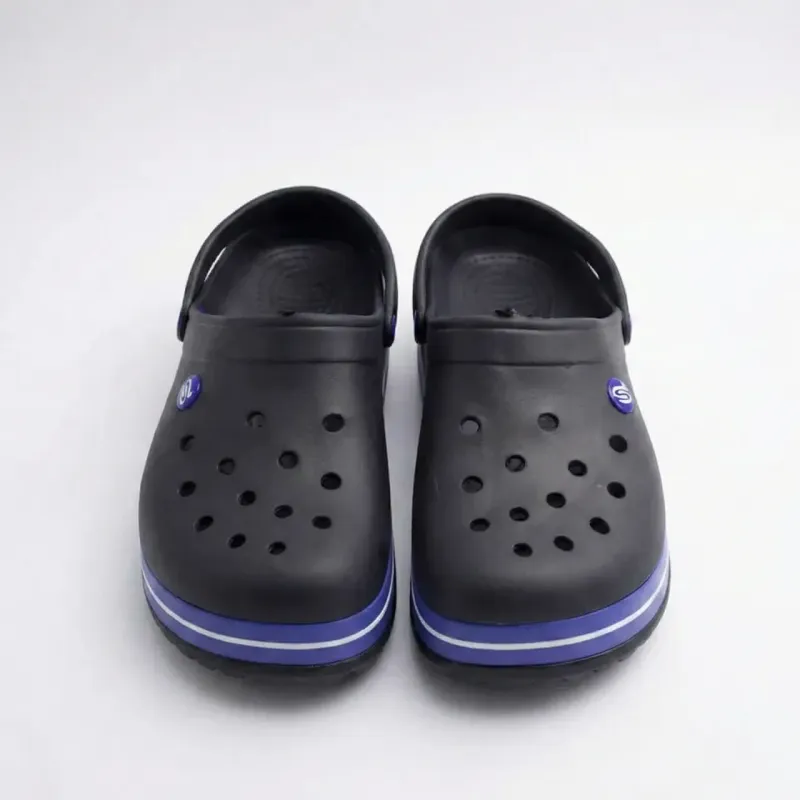 Ці темно-сині сабо в спортивному стилі — чудовий вибір для активних людей. Класичний темно-синій верх вдало поєднується з яскравою підошвою, прикрашеною блакитною та білою смужками. Такий дизайн нагадує кросівки і виглядає дуже сучасно. Модель виготовлена з легкого та м'якого матеріалу EVA (пінка). Взуття не натирає, чудово амортизує та не ковзає. Отвори для вентиляції забезпечують комфорт навіть у найспекотніші дні. Поворотний ремінець надійно фіксує п'яту, що дозволяє бігати, грати в пляжний волейбол або просто активно проводити час. Завдяки широкій розмірній сітці (36-46), модель підходить як чоловікам, так і жінкам. Характеристики: Тип: Сабо / Крокси. Стиль: Спортивний (Sport). Матеріал: EVA (пінка). Колір: Темно-синій (Navy) зі смугастою підошвою. Розмірний ряд: 36, 37, 38, 39, 40, 41, 42, 43, 44, 45, 46. Особливості: Декор на підошві, логотип на кнопці.