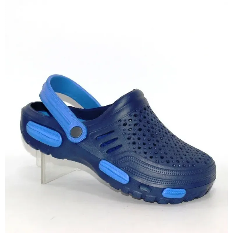 Ці сині сабо з контрастним блакитним ремінцем — універсальне взуття для всієї родини. Завдяки широкому розмірному ряду (від 36 до 46), вони підійдуть як підліткам та жінкам, так і чоловікам. Модель виготовлена з легкого матеріалу EVA (пінка), який чудово амортизує та не навантажує ноги. Верхня частина має густу перфорацію, що забезпечує максимальну циркуляцію повітря — ідеально для спекотного літа. Яскравий блакитний поворотний ремінець та бічні вставки додають моделі спортивного стилю та дозволяють надійно зафіксувати взуття на нозі для активного відпочинку. Характеристики: Тип: Сабо / Крокси. Стать: Унісекс. Матеріал: EVA (пінка). Колір: Темно-синій з блакитним (Dark Blue/Light Blue). Розмірний ряд: 36, 37, 38, 39, 40, 41, 42, 43, 44, 45, 46. Особливості: Контрастний ремінець, посилена вентиляція.