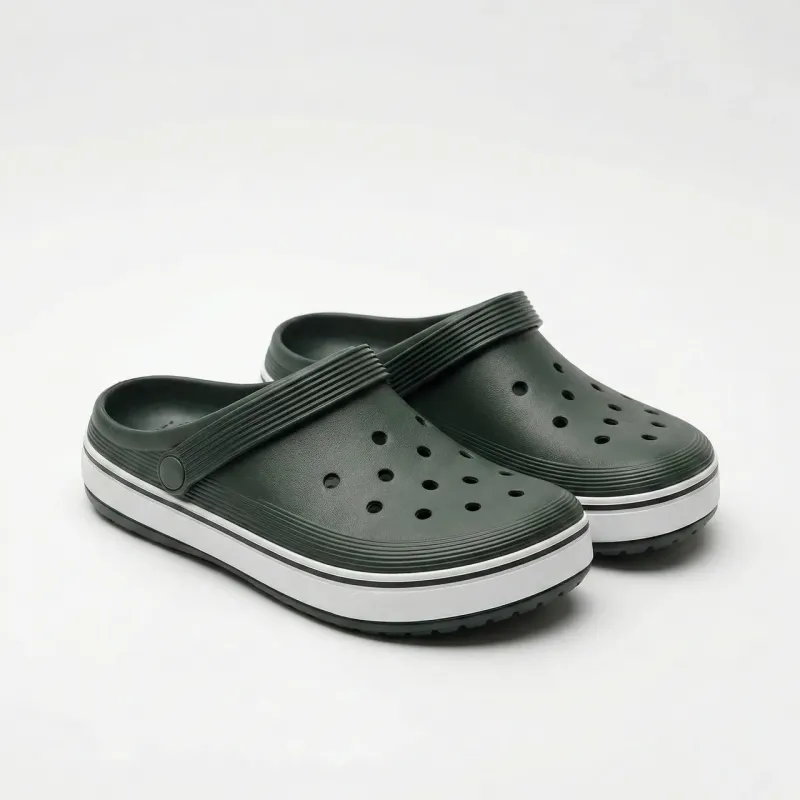 Ці темно-зелені сабо (крокси) — це еталон комфорту та практичності. Виготовлені з сучасного матеріалу EVA (пінка), вони неймовірно легкі, м'які та зносостійкі. Модель має класичний дизайн з отворами для вентиляції, що дозволяє ногам "дихати" навіть у найбільшу спеку. Поворотний ремінець п'яти дає можливість носити їх як класичні сабо (з фіксацією) або як звичайні шльопанці. Стильна біла смуга на підошві додає взуттю спортивного характеру та свіжості. Вони не бояться води, легко миються, миттєво сохнуть і не ковзають. Ідеальний вибір для відпочинку на природі, роботи в саду чи поїздок на море. Характеристики: Тип: Сабо / Крокси. Матеріал: EVA (пінка) — антибактеріальний, легкий. Колір: Темно-зелений / Хакі (Dark Green). Особливості: Біла окантовка підошви, поворотний ремінець. Призначення: Пляж, сад, басейн, дім.