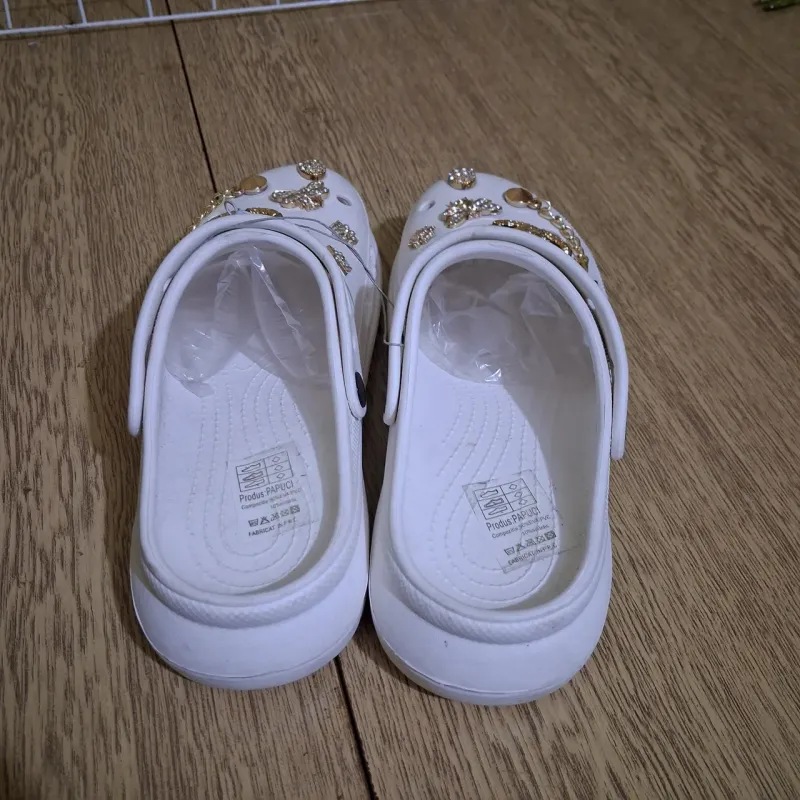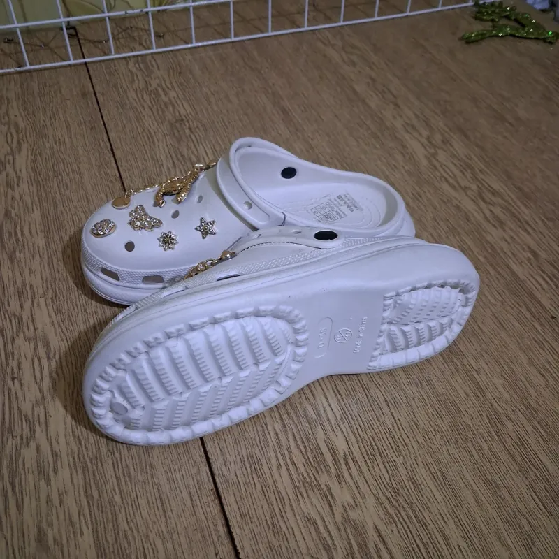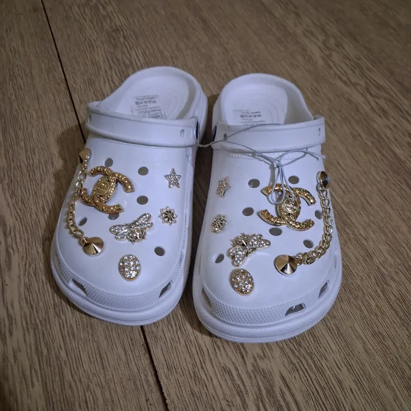 Шукаєте ідеальне поєднання комфорту та яскравого стилю? Ці жіночі білі сабо на платформі — справжній хіт сезону! Модель виготовлена з сучасного матеріалу ЕВА, що робить її невагомою та неймовірно зручною. Висока підошва візуально подовжує ноги, не обтяжуючи ходу, а ергономічна устілка забезпечує комфорт навіть при тривалому носінні. Головна "фішка" цієї пари — розкішний декор. Золотисті ланцюжки, фігурні джибітси у вигляді логотипів, метеликів та зірок, інкрустовані камінням, перетворюють звичайні шльопанці на модний акцент вашого образу. Поворотний ремінець дозволяє надійно зафіксувати п'яту, перетворюючи шльопанці на зручні сандалі. Це взуття ідеально підходить як для прогулянок містом чи відпочинку на пляжі, так і як професійне взуття для лікарів, косметологів або перукарів, які цінують стиль на робочому місці. Матеріал стійкий до вологи, не вбирає запахи та дуже легко миється. Характеристики: Матеріал: Піна ЕВА (EVA) — м'який, гіпоалергенний, зносостійкий Колір: Білий Декор: Знімні джибітси (золотистий метал, стрази, ланцюжки) Тип підошви: Платформа (потовщена підошва) Сезон: Літо / Весна / Осінь (для приміщень) Стать: Жіноча Розмірний ряд: 36-41 Країна виробник: Китай