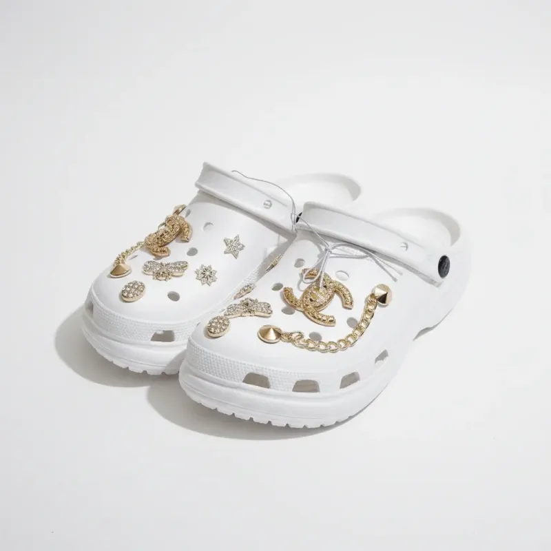 Шукаєте ідеальне поєднання комфорту та яскравого стилю? Ці жіночі білі сабо на платформі — справжній хіт сезону! Модель виготовлена з сучасного матеріалу ЕВА, що робить її невагомою та неймовірно зручною. Висока підошва візуально подовжує ноги, не обтяжуючи ходу, а ергономічна устілка забезпечує комфорт навіть при тривалому носінні. Головна "фішка" цієї пари — розкішний декор. Золотисті ланцюжки, фігурні джибітси у вигляді логотипів, метеликів та зірок, інкрустовані камінням, перетворюють звичайні шльопанці на модний акцент вашого образу. Поворотний ремінець дозволяє надійно зафіксувати п'яту, перетворюючи шльопанці на зручні сандалі. Це взуття ідеально підходить як для прогулянок містом чи відпочинку на пляжі, так і як професійне взуття для лікарів, косметологів або перукарів, які цінують стиль на робочому місці. Матеріал стійкий до вологи, не вбирає запахи та дуже легко миється. Характеристики: Матеріал: Піна ЕВА (EVA) — м'який, гіпоалергенний, зносостійкий Колір: Білий Декор: Знімні джибітси (золотистий метал, стрази, ланцюжки) Тип підошви: Платформа (потовщена підошва) Сезон: Літо / Весна / Осінь (для приміщень) Стать: Жіноча Розмірний ряд: 36-41 Країна виробник: Китай