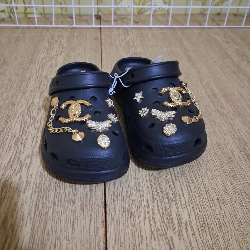 Стильні та ефектні жіночі сабо з ексклюзивним декором. Ця модель перетворює звичайне зручне взуття на модний аксесуар. Чорна основа ідеально контрастує із золотими прикрасами: масивними ланцюжками, витонченими фігурками та перлинами. Це ідеальний вибір для тих, хто хоче бути в тренді навіть на пляжі чи прогулянці. Особливості: Дизайн: Трендовий декор у золотому кольорі (ланцюжки знімаються за бажанням). Комфорт: Зручна ергономічна підошва з матеріалу ЕВА. Універсальність: Підходять як під купальник, так і під джинси чи літню сукню. Практичність: Легко миються, швидко сохнуть. Характеристики: Матеріал: Піна ЕВА Колір: Чорний Декор: Золоті ланцюжки, фігурки (знімні) Розміри: 36-41