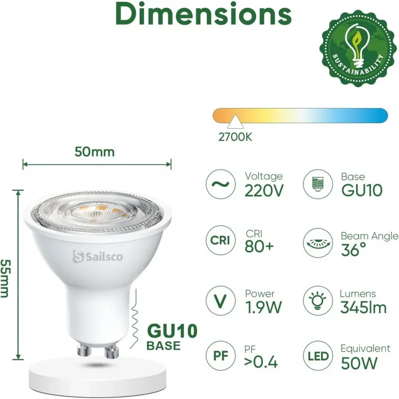 • 【Тепле біле світло】 - світлодіодна лампа sailsco GU10 потужністю 1.9 Вт підходить для вхідної напруги 220-240 В змінного струму, тепле біле світло 2700K, 345 люмен, не потрібен час на прогрівання для досягнення максимального рівня освітлення. Зверніть увагу: цю лампу не можна регулювати яскравість.