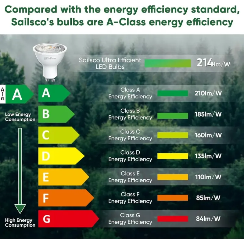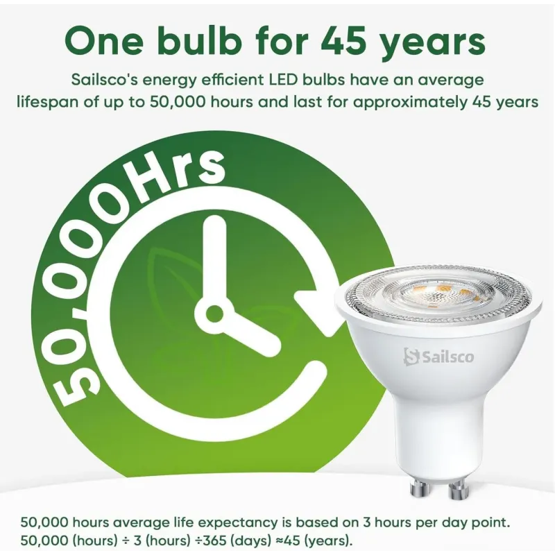• 【Клас енергоефективності A】 – технологія світлодіодних ламп sailsco GU10 відповідає європейським стандартам енергоефективності класу A, споживає менше енергії та забезпечує більше світла, ніж лампи EF. Середній термін служби до 50 000 годин та термін служби понад 45 років, розрахований на 3-годинний робочий день, значно знижує витрати на заміну.