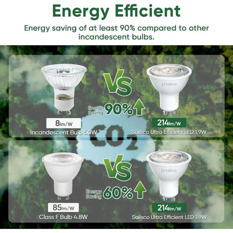• 【Надзвичайно низьке енергоспоживання】- світлодіодна лампа sailsco GU10 споживає 1,9 Вт, що еквівалентно лампочці потужністю 50 Вт, економить 96,2% енергії та коштує лише 1,12 євро на рік, заощаджуючи 1280,03 євро протягом усього терміну служби (на основі щоденного використання протягом 3 годин за ціною 0,54 євро/кВт·год; це може змінюватися залежно від ціни на електроенергію та обсягу використання).