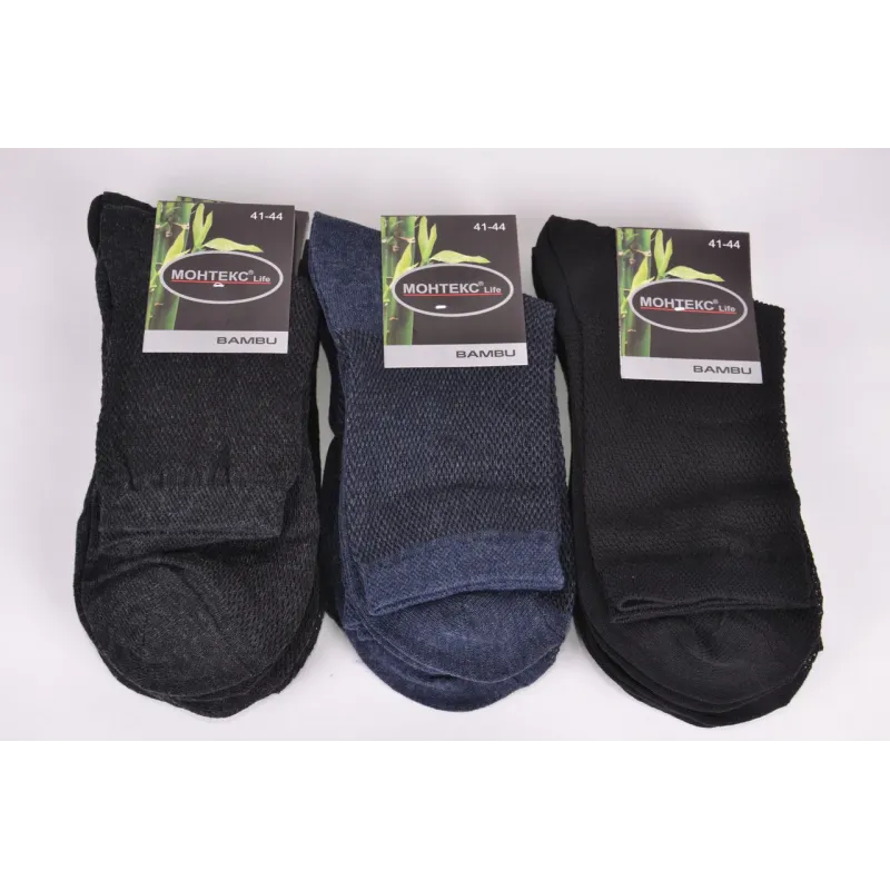 Чоловічі бавовняні шкарпетки з сіткою торгової марки "Монтекс", гарна якість, однотонні, різні забарвлення. Колір ― фото Розмір ― Універсальний (тягнуться від 41 до 44 розміру) Кількість виробів в упаковці ― 12 пар (одного розміру, mix кольорів) Склад ― 95% Бамбук 5% Лайкра Виробництво ― Україна