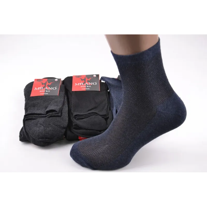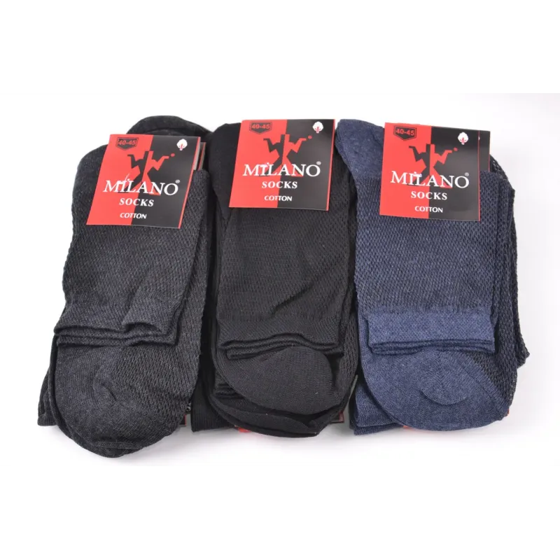 Чоловічі бавовняні шкарпетки з сіткою хорошої якості. Колір ― Як на фото Розмір ― 40-45 Кількість виробів в упаковці ― 12 пар (одного розміру, mix кольорів) Склад ― 100% Cotton Виробництво ― Україна