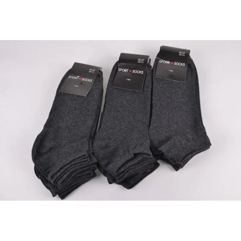 Чоловічі бавовняні занижені шкарпетки торгової марки "Житомир", гарна якість, однотонні. Сезон -- Весна-Осінь Колір ― Темно сірий Розмір ― 25-27 (тягнуться від 39 до 41 розміру) Кількість виробів в упаковці ― 12 пар (одного розміру і кольору) Склад ― 80% Бавовна, 17% Polyamid, 3% Elastan Виробництво ― Україна