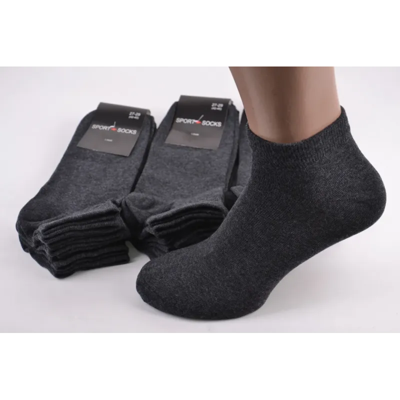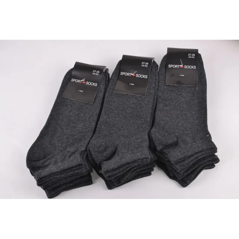 Чоловічі бавовняні занижені шкарпетки торгової марки "Житомир", гарна якість, однотонні. Сезон -- Весна-Осінь Колір ― Темно сірий Розмір ― 29-29 (тягнуться від 42 до 45 розміру) Кількість виробів в упаковці ― 12 пар (одного розміру і кольору) Склад ― 80% Бавовна, 17% Polyamid, 3% Elastan Виробництво ― Україна