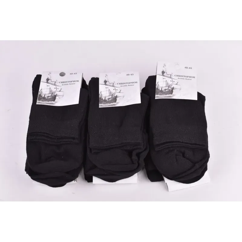Чоловічі бавовняні шкарпетки хорошої якості. Колір ― Чорний Розмір ― Універсальний ( тягнуться від 40 до 45 розміру) Кількість виробів в упаковці ― 12 пар (одного розміру та кольору) Склад ― 95% Бавовна, 5% Еластан Виробництво ― Україна
