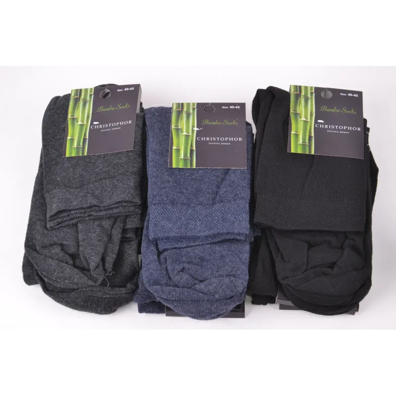 Чоловічі бавовняні шкарпетки хорошої якості, однотонні, різні забарвлення. Колір ― Як на фото Розмір ― Універсальний (тягнуться від 40 до 45 розміру) Кількість виробів в упаковці ― 12 пар (одного розміру, mix кольорів) Склад ― 95% Bambu, 5% Elastan Виробництво ― Китай
