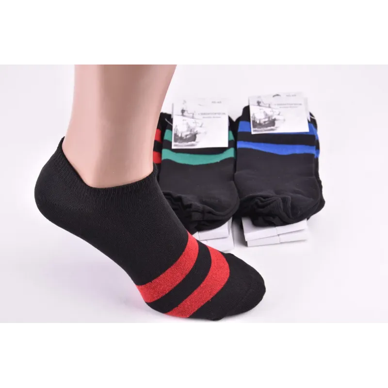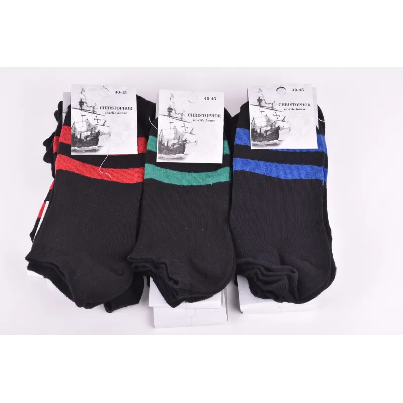 Чоловічі бавовняні занижені шкарпетки хорошої якості. Колір ― фото Розмір ― 40-45 Кількість виробів в упаковці ― 12 пар (одного розміру) Склад ― 95% Cotton, 10% Elastan Виробництво ― Україна