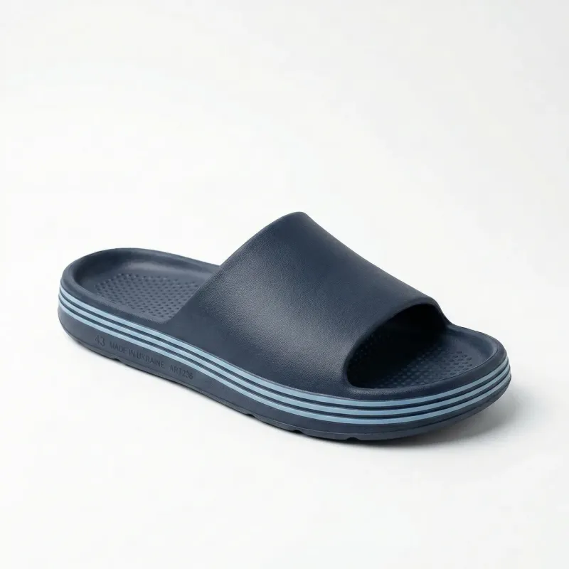 Класичні чоловічі шльопанці (сланці) темно-синього кольору — це незамінне взуття для літнього сезону, відвідування басейну, сауни або використання як змінного взуття. Лаконічний дизайн з трьома смужками на підошві робить їх універсальними та стильними. Модель виготовлена методом суцільного лиття з матеріалу ЕВА (піна). Це забезпечує взуттю високу міцність та довговічність — тут просто нічому відриватися. Шльопанці максимально легкі, не вбирають воду та запахи, легко миються та миттєво висихають. Текстурована устілка з "пухирцями" створює легкий масажний ефект та запобігає ковзанню мокрої стопи всередині взуття. Підошва має спеціальний протектор "ялинка", що забезпечує хороше зчеплення з мокрими поверхнями (плитка, бортик басейну). Це практичний вибір від українського виробника за доступною ціною. Характеристики: Матеріал: Піна ЕВА (EVA) Колір: Темно-синій (Navy) Сезон: Літо / Цілорічно (басейн, душ) Стать: Чоловічі Розміри в наявності: 41, 42, 43, 44, 45, 46 Країна виробник: Україна (Арт. 236)