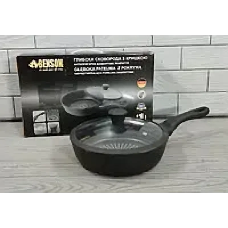 Ця сковорода стане найчастішим інструментом на кухні. Вона виконана з екологічно чистого та міцного матеріалу, що відповідає всім світовим вимогам якості. Ергономічна ручка не нагрівається, приємно лягає в руку та забезпечує зручну експлуатацію. Корпус надійний, він добре захищений від подряпин та деформацій. Після того як їжа буде готова, сковороду легко можна очистити самостійно під гарячою водою. Їжа не буде прилипати до дна і стін при правильному використанні.