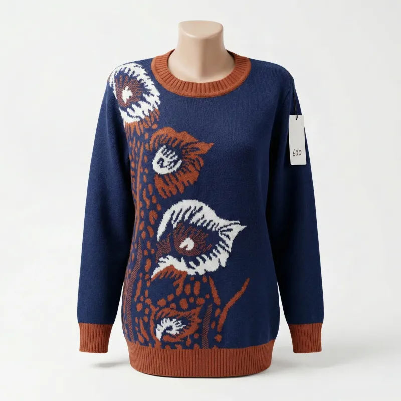• Ексклюзивний дизайн: Глибокий темно-синій колір слугує ідеальним фоном для великого, майстерно вив'язаного малюнка. Контрастні теракотові манжети, низ та горловина роблять образ завершеним та дуже стильним.