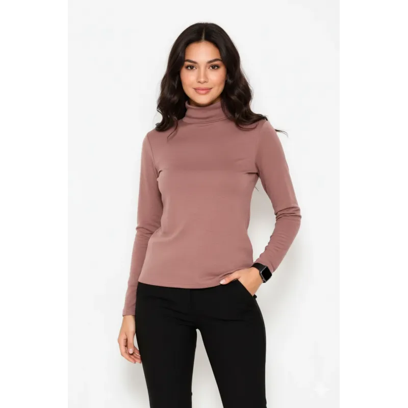 Модель представлена в актуальному та ніжному кольорі **пильної троянди (пудри/лілового)**, який легко поєднується з класичними чорними, сірими та синіми елементами. Високий комір-стійка робить цю водолазку ідеальним вибором для офісних та повсякденних багатошарових образів.