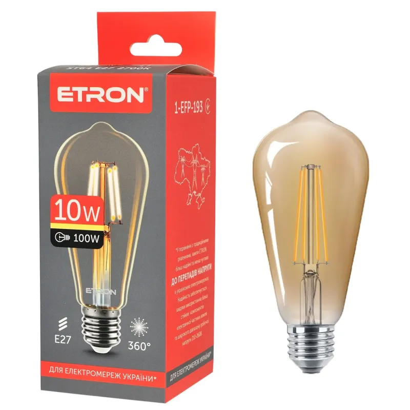 Світлодіодна філаментна лампа - ETRON Filament ST64 10W E27 2700K золотоСвітлодіодна філаментна лампа ETRON Filament ST64 10W E27 2700K золото призначена для внутрішнього освітлення житлових приміщень та використання в освітлювальних приладах з відповідним ступенем захисту на відкритому повітрі. Ці лампи виготовляються за новітньою технологією світлодіодних ниток LED Filament, що забезпечує високі показники енергоефективності (100Lm/W). Вони створюють потужний світловий потік і не поступаються своєю функціональністю іншим світлодіодним моделям. Однією з головних переваг цієї моделі є її висока енергоефективність за мінімального тепловиділення. Філаментні лампи здатні генерувати більший світловий потік при менших енерговитратах і мають тривалий термін служби.
