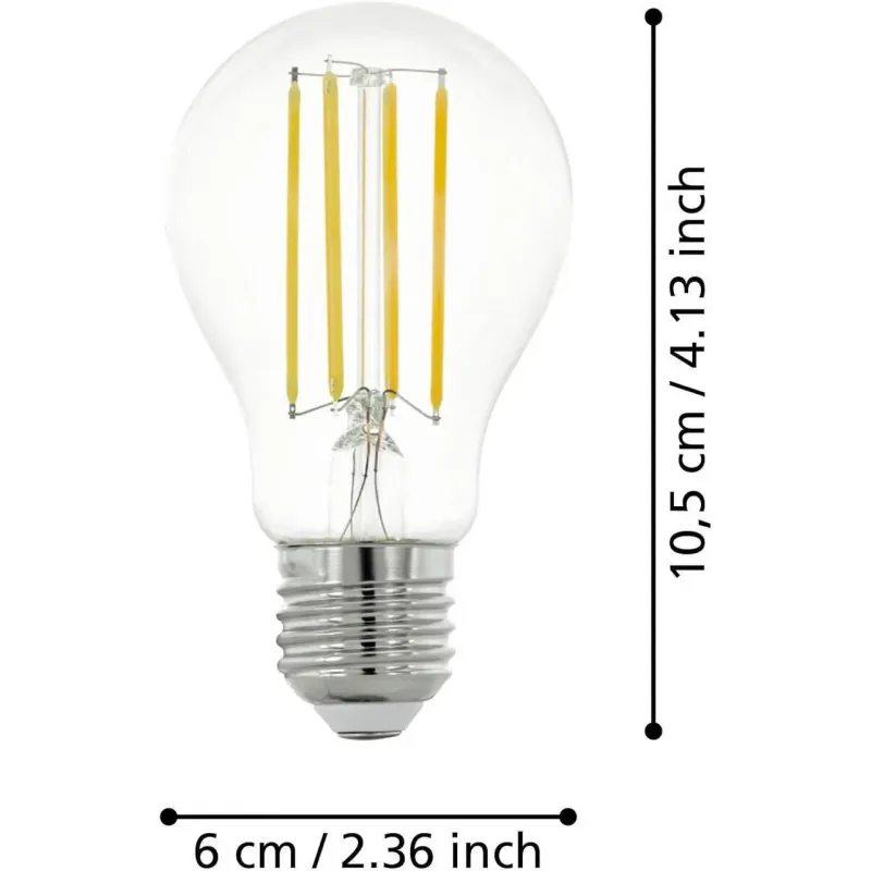 Світлодіодна лампа Eglo Edison призначена для декоративного та основного освітлення житлових і комерційних приміщень. Вона поєднує класичну форму A60, прозору скляну колбу та LED filament технологію, яка відтворює вигляд традиційної лампи розжарювання.
