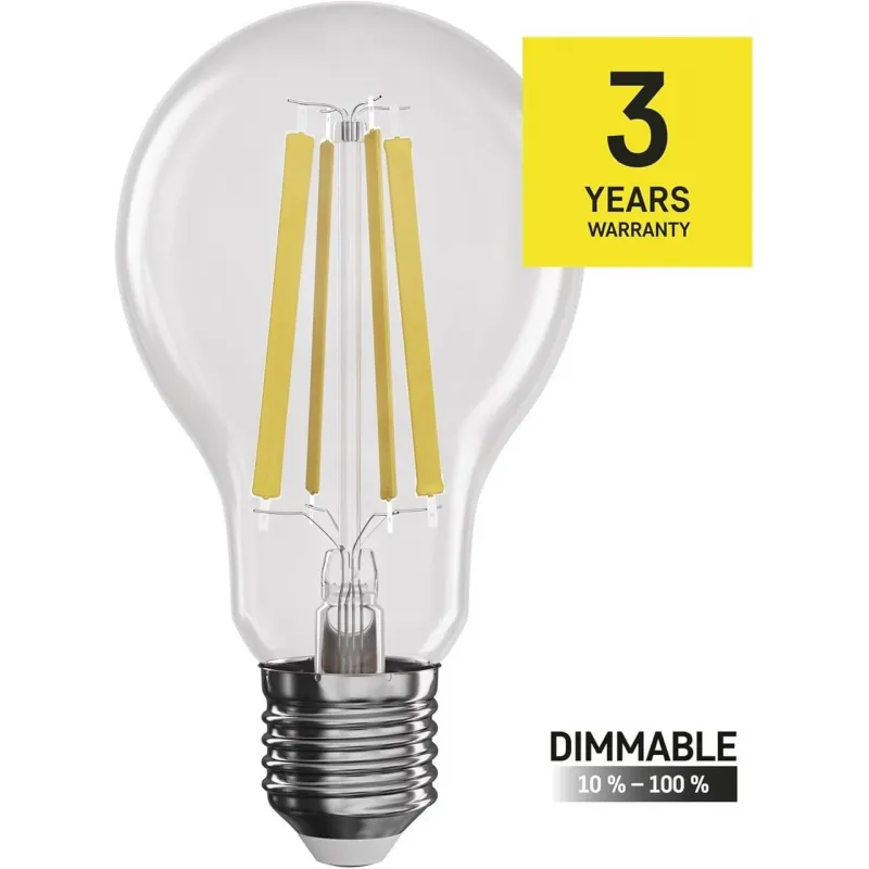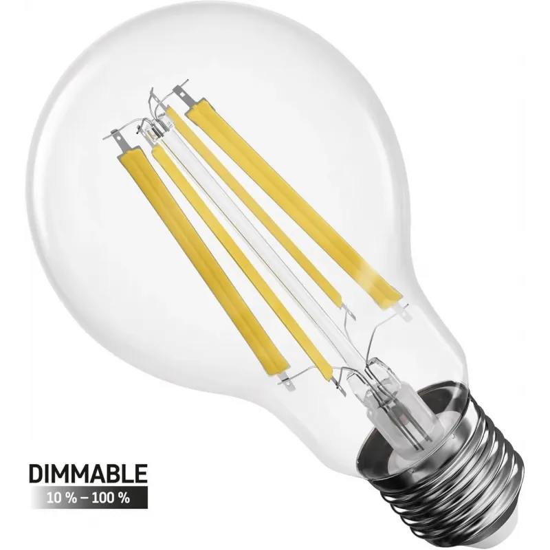 Світлодіодна лампа EMOS Dimmable Edition A60 виконана у класичній формі з прозорою колбою та LED-нитками, що створюють м’яке тепле світло. Завдяки потужності 11 Вт вона ефективно замінює лампу розжарювання на 100 Вт, забезпечуючи високу яскравість при низькому споживанні енергії.